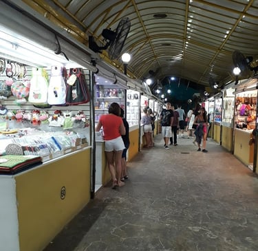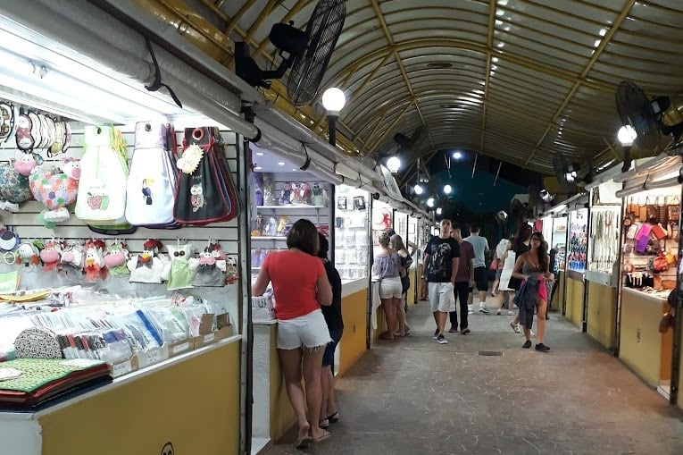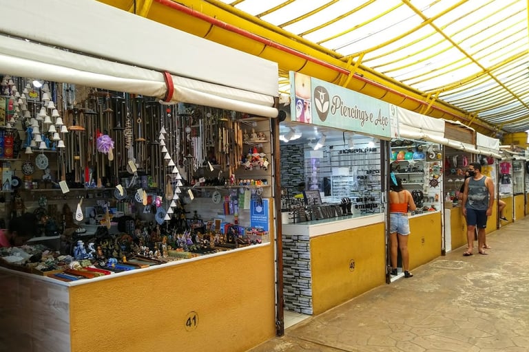 Mercado tradicional com mais de 80 vendedores locais que expõem artesanato, joias, acessórios e presentes